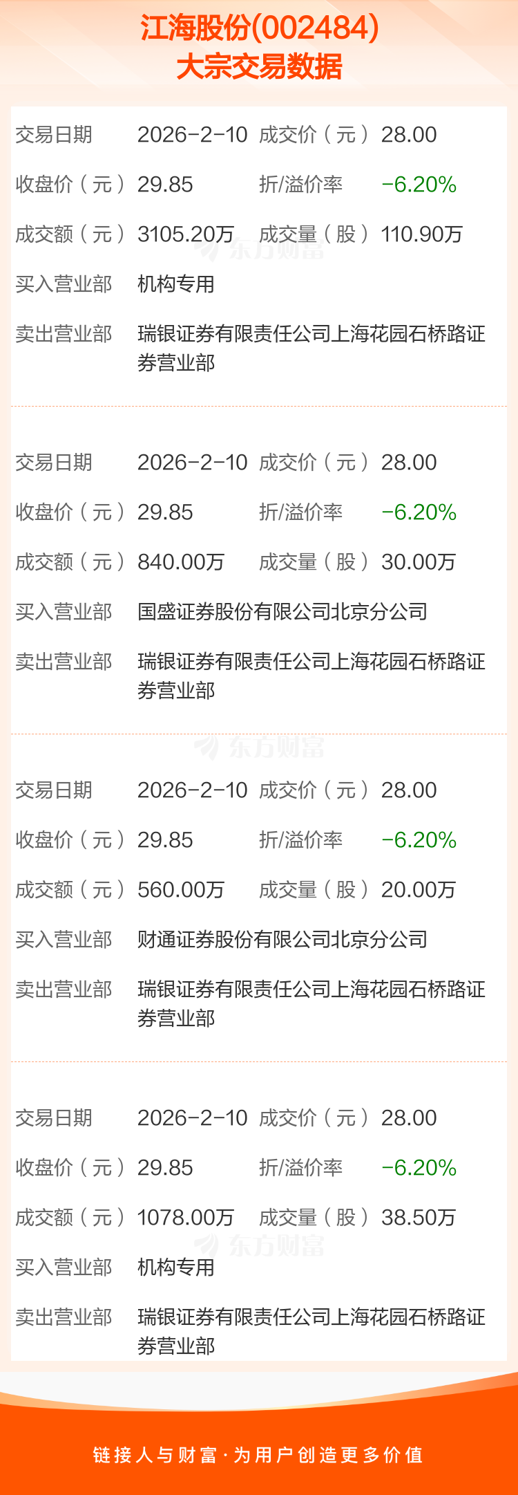 2026年2月10日,江海股份发生4笔大宗交易,共成交199.40万股,成交金额5583.20万元,占其流通市值比例为0.23%。