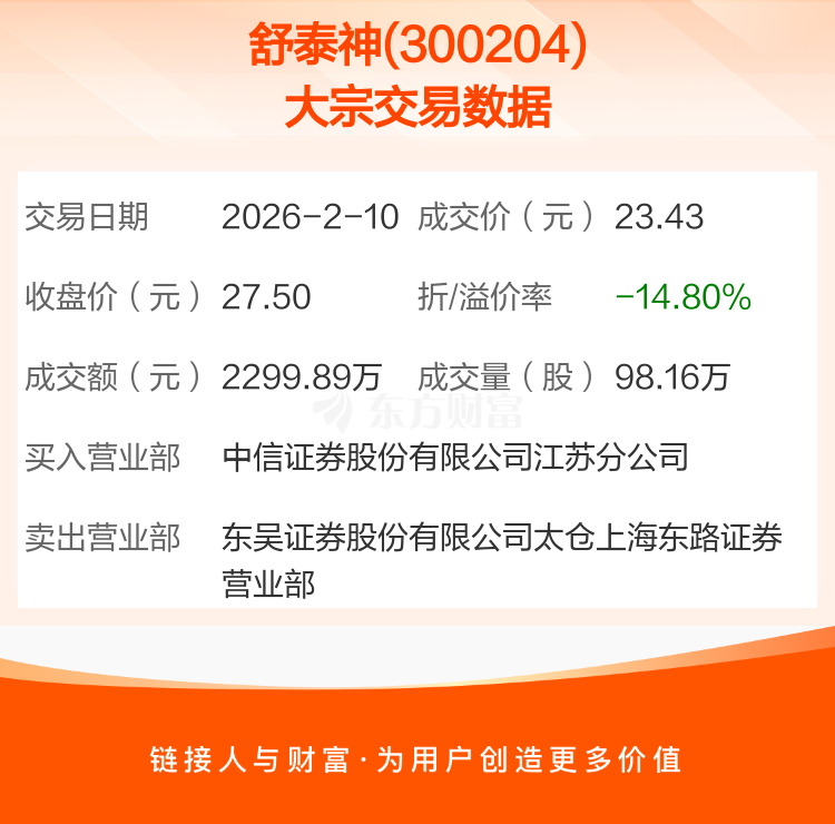 2026年2月10日,舒泰神发生1笔大宗交易,共成交98.16万股,成交金额2299.89万元,占其流通市值比例为0.18%。