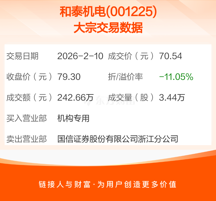 2026年2月10日,和泰机电发生1笔大宗交易,共成交3.44万股,成交金额242.66万元,占其流通市值比例为0.15%。