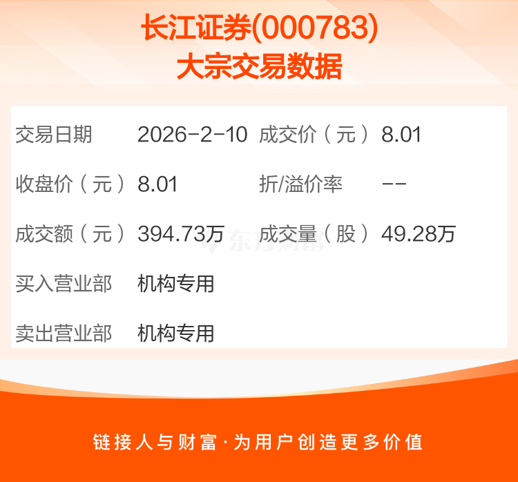 2026年2月10日,长江证券发生1笔大宗交易,共成交49.28万股,成交金额394.73万元。