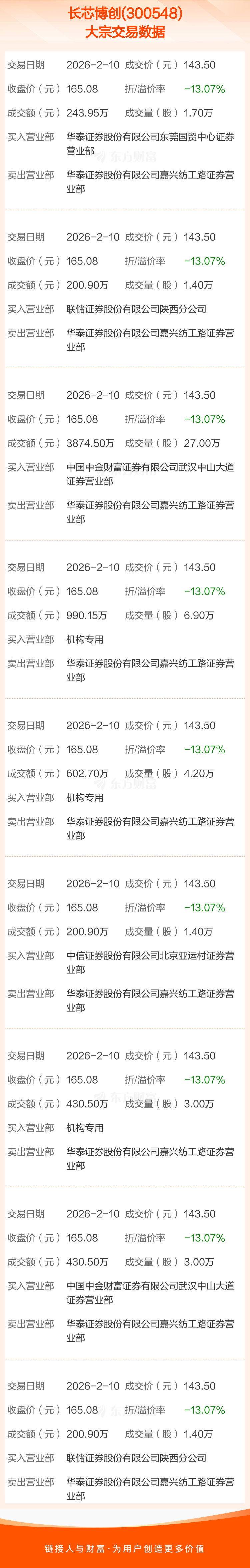 2026年2月10日,长芯博创发生9笔大宗交易,共成交50.00万股,成交金额7175.00万元,占其流通市值比例为0.16%。