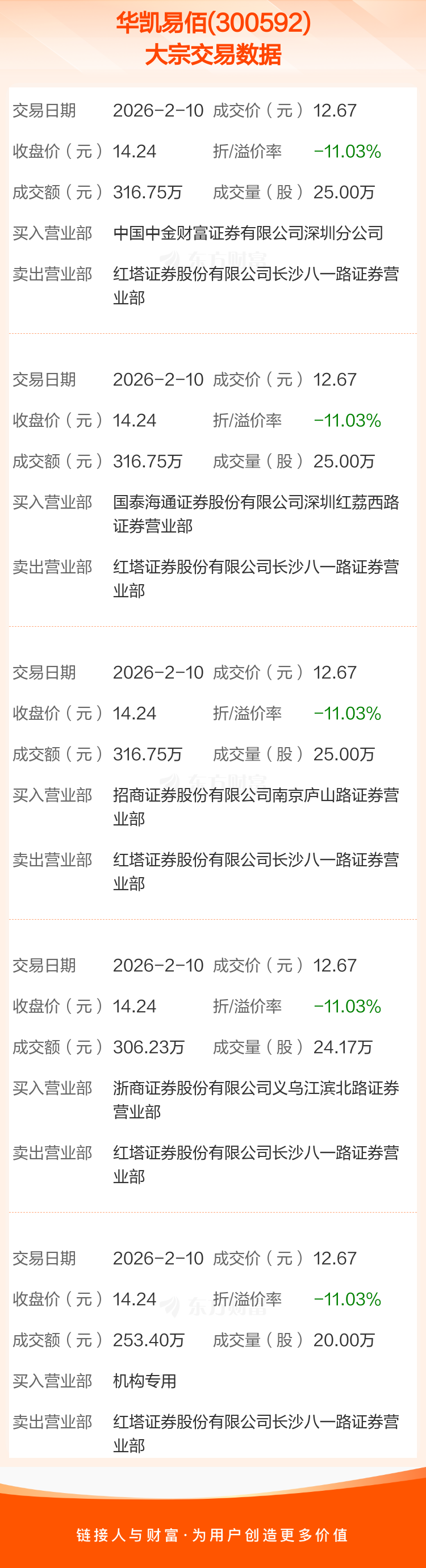 大宗交易:华凯易佰成交1509.88万元,折价11.03%(2-10)