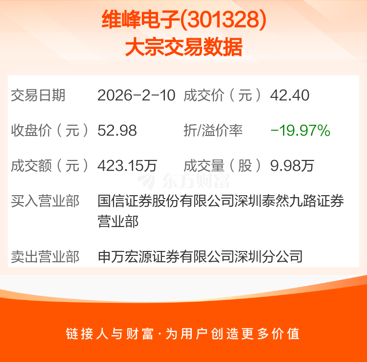 2026年2月10日,维峰电子发生1笔大宗交易,共成交9.98万股,成交金额423.15万元,占其流通市值比例为0.16%。