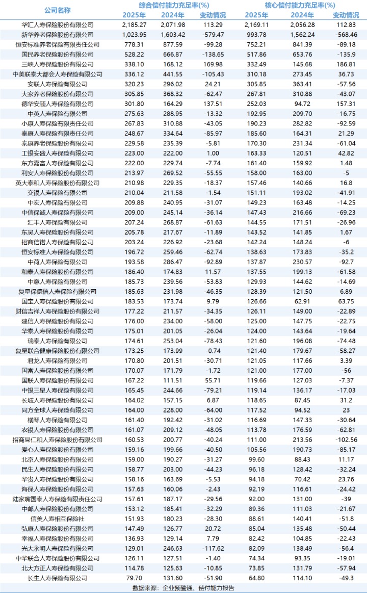 虽然2025年数据显示,行业整体偿付能力充足率保持在较高水平,绝大多数险企远高于监管红线,风险缓冲区充足。但绝大多数险企的偿付能力充足率较2024年出现下滑。