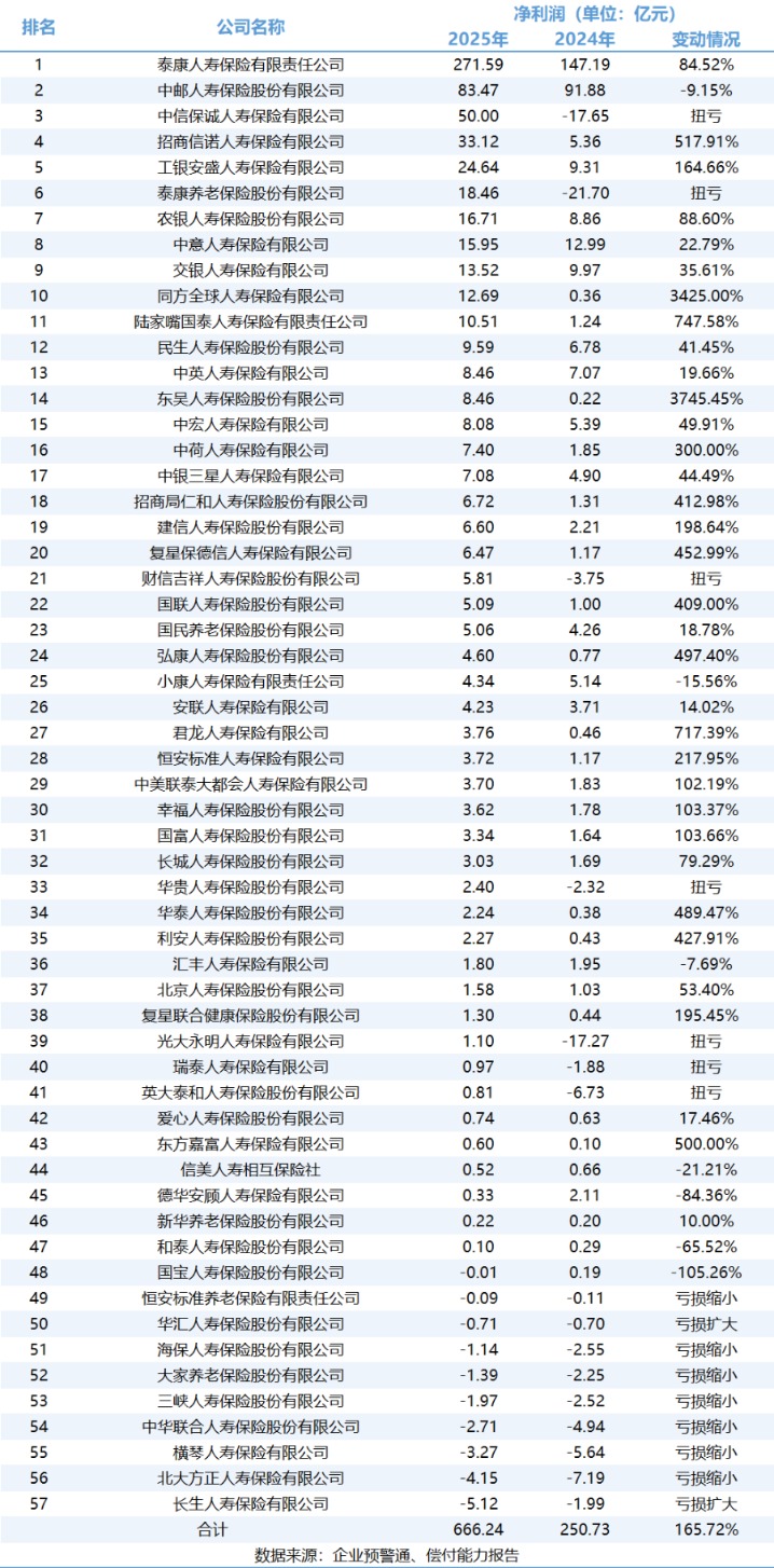 2025年,已披露数据的57家非上市寿险公司净利润共计666.24亿元,较2024年同期的250.73亿元增长165.72%。