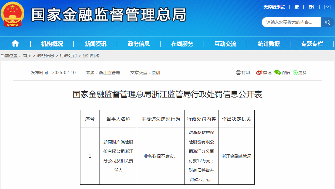 2月10日,据浙江金融监管局披露,因业务数据不真实,浙商财产保险股份有限公司浙江分公司被罚款12万元,相关责任人高云被警告并罚款2万元。