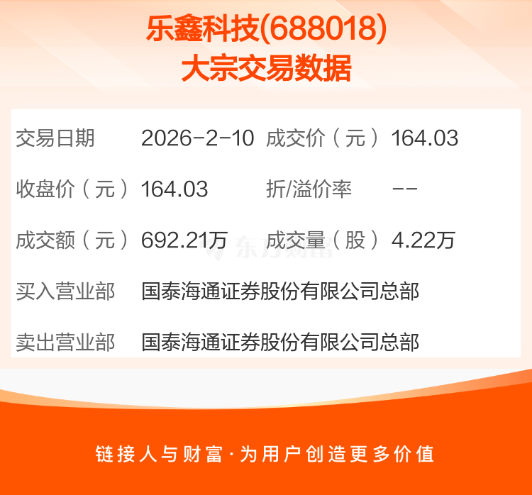 2026年2月10日,乐鑫科技发生1笔大宗交易,共成交4.22万股,成交金额692.21万元,占其流通市值比例为0.03%。