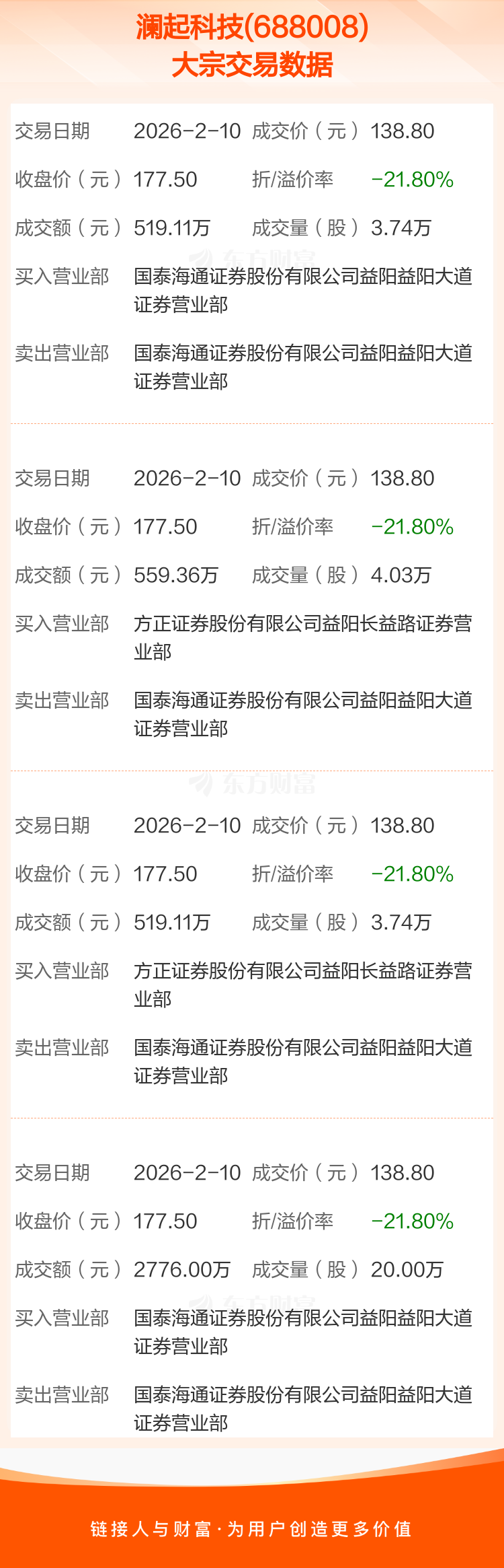 2026年2月10日,澜起科技发生4笔大宗交易,共成交31.51万股,成交金额4373.58万元,占其流通市值比例为0.02%。