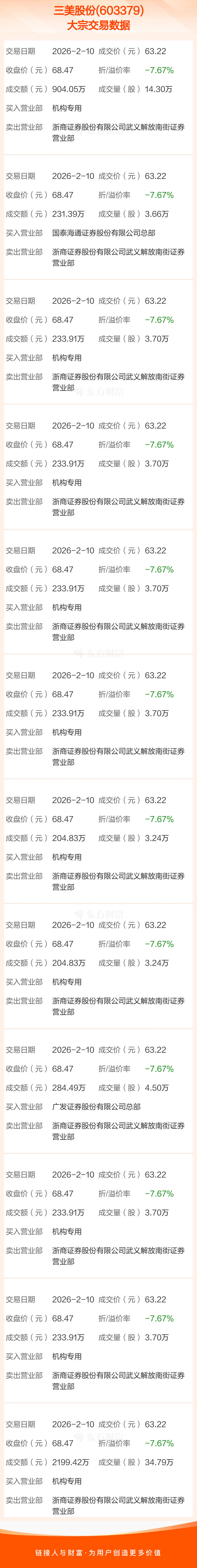 2026年2月10日,三美股份发生12笔大宗交易,共成交85.93万股,成交金额5432.47万元,占其流通市值比例为0.13%。