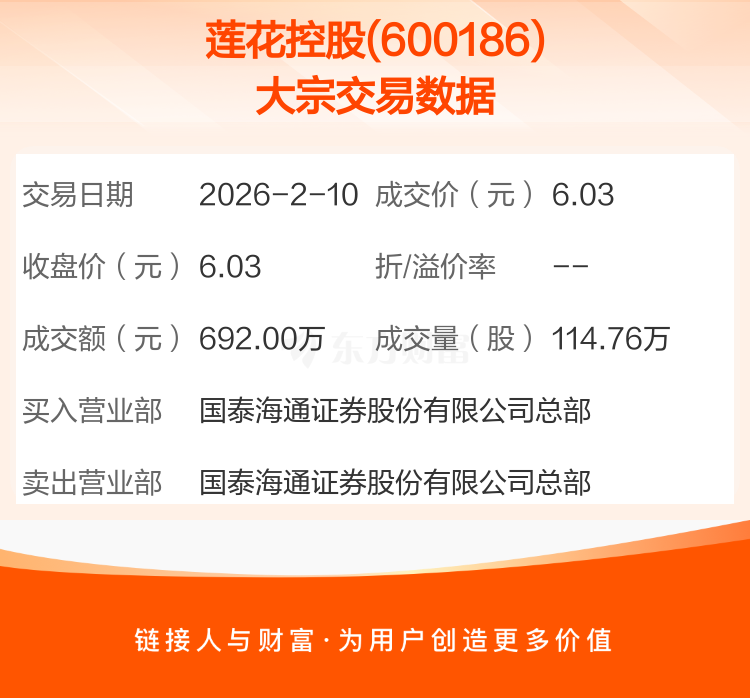2026年2月10日,莲花控股发生1笔大宗交易,共成交114.76万股,成交金额692.00万元,占其流通市值比例为0.06%。