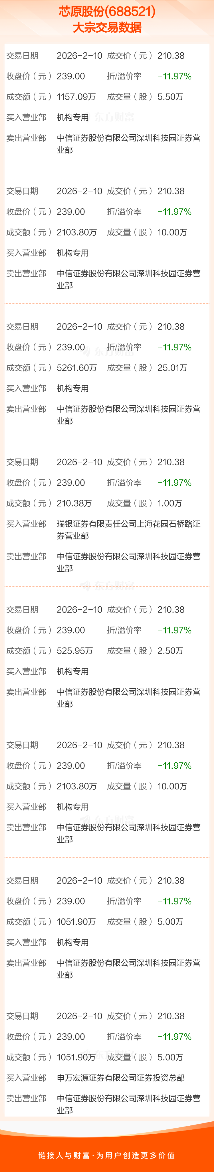 2026年2月10日,芯原股份发生8笔大宗交易,共成交64.01万股,成交金额1.35亿元,占其流通市值比例为0.11%。