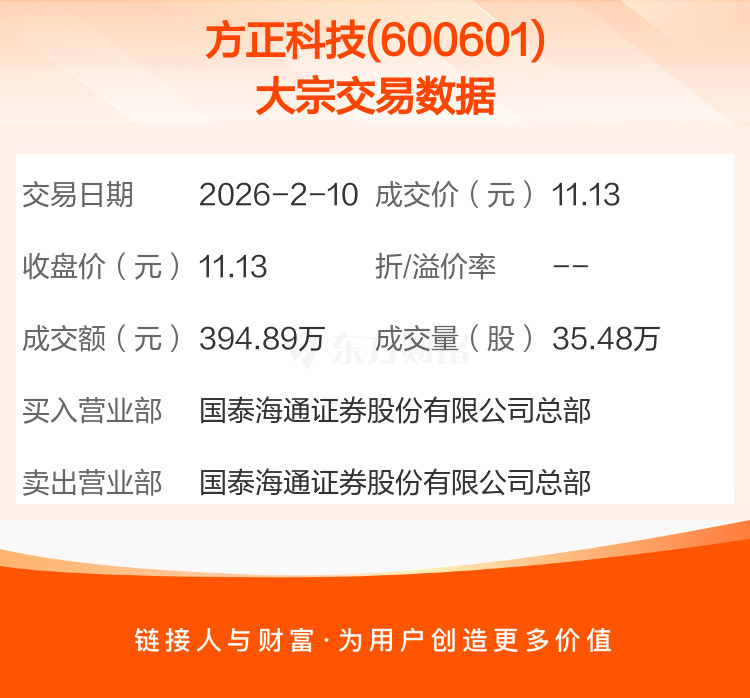2026年2月10日,方正科技发生1笔大宗交易,共成交35.48万股,成交金额394.89万元。