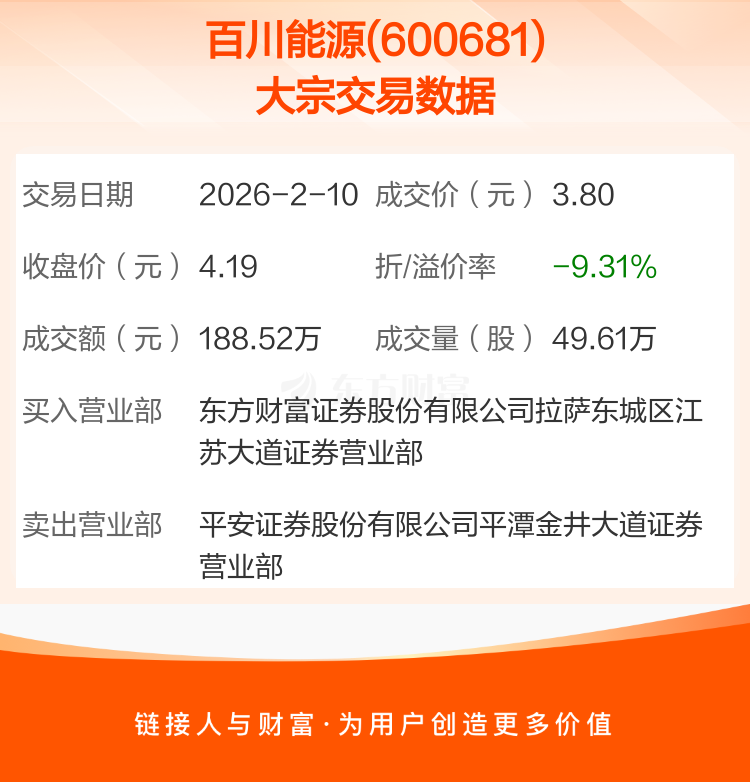 2026年2月10日,百川能源发生1笔大宗交易,共成交49.61万股,成交金额188.52万元,占其流通市值比例为0.03%。