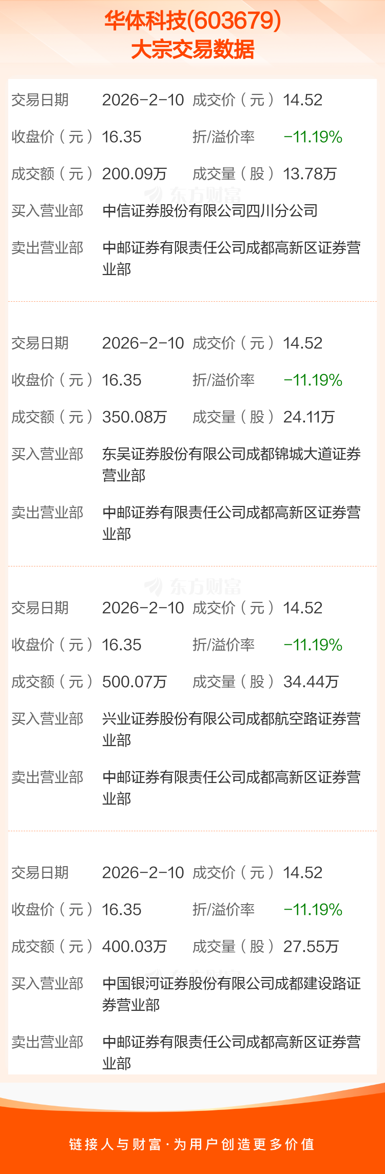 2026年2月10日,华体科技发生4笔大宗交易,共成交99.88万股,成交金额1450.27万元,占其流通市值比例为0.53%。