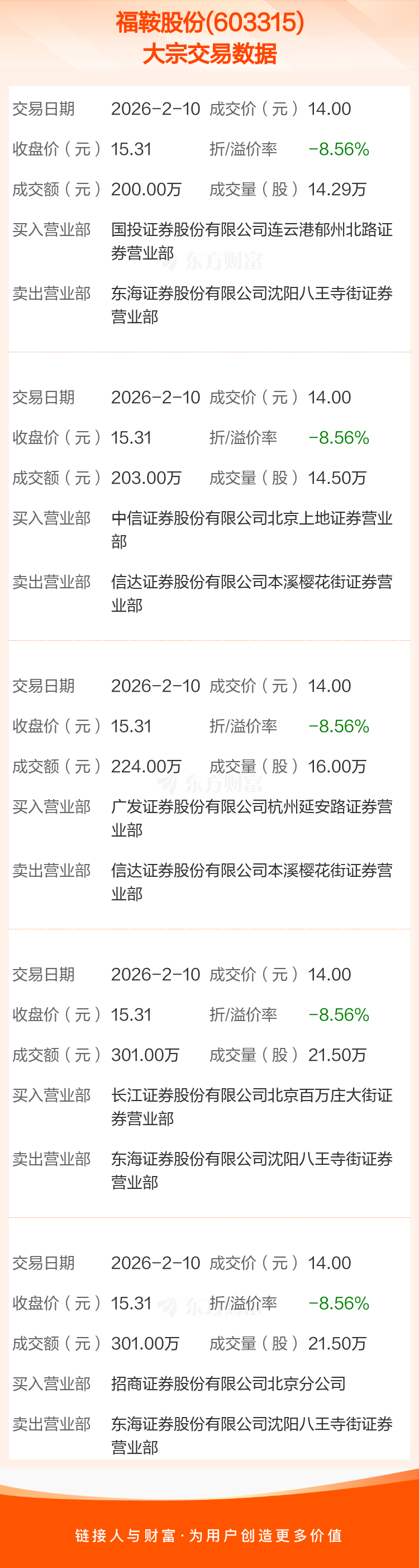 2026年2月10日,福鞍股份发生5笔大宗交易,共成交87.79万股,成交金额1229.00万元,占其流通市值比例为0.25%。
