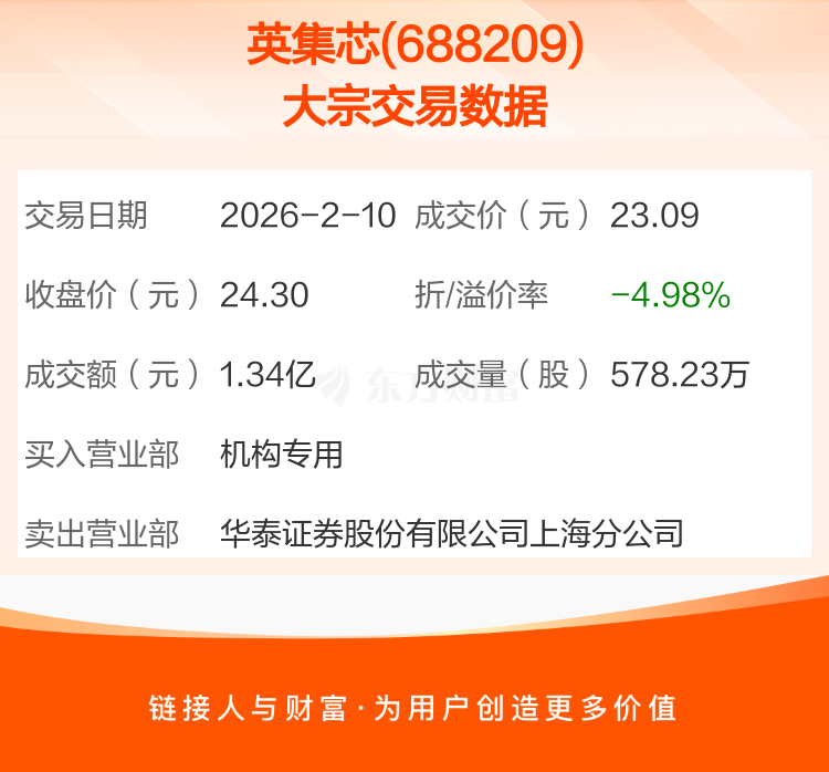 大宗交易:英集芯成交1.34亿元,折价4.98%(2-10)