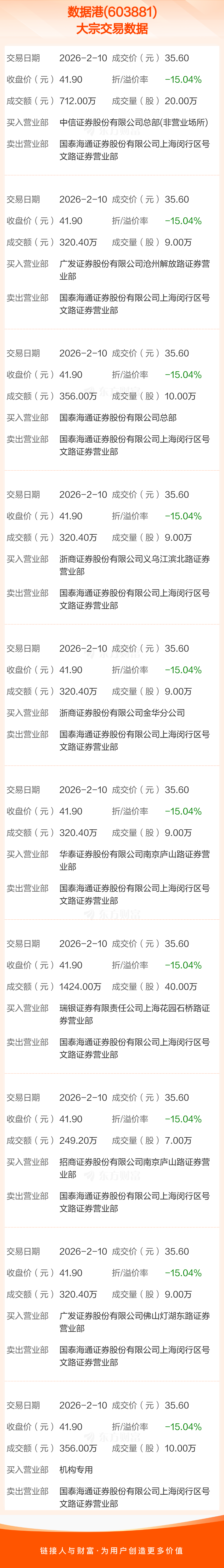 2026年2月10日,数据港发生10笔大宗交易,共成交132.00万股,成交金额4699.20万元,占其流通市值比例为0.16%。