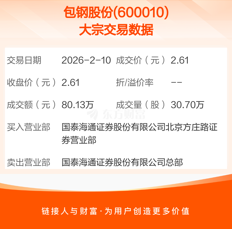 2026年2月10日,包钢股份发生1笔大宗交易,共成交30.70万股,成交金额80.13万元。