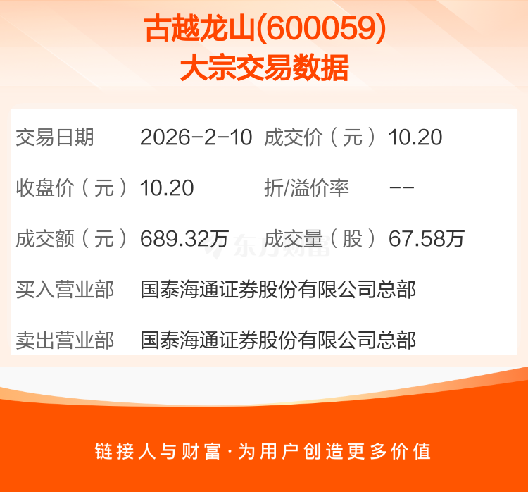 2026年2月10日,古越龙山发生1笔大宗交易,共成交67.58万股,成交金额689.32万元,占其流通市值比例为0.07%。