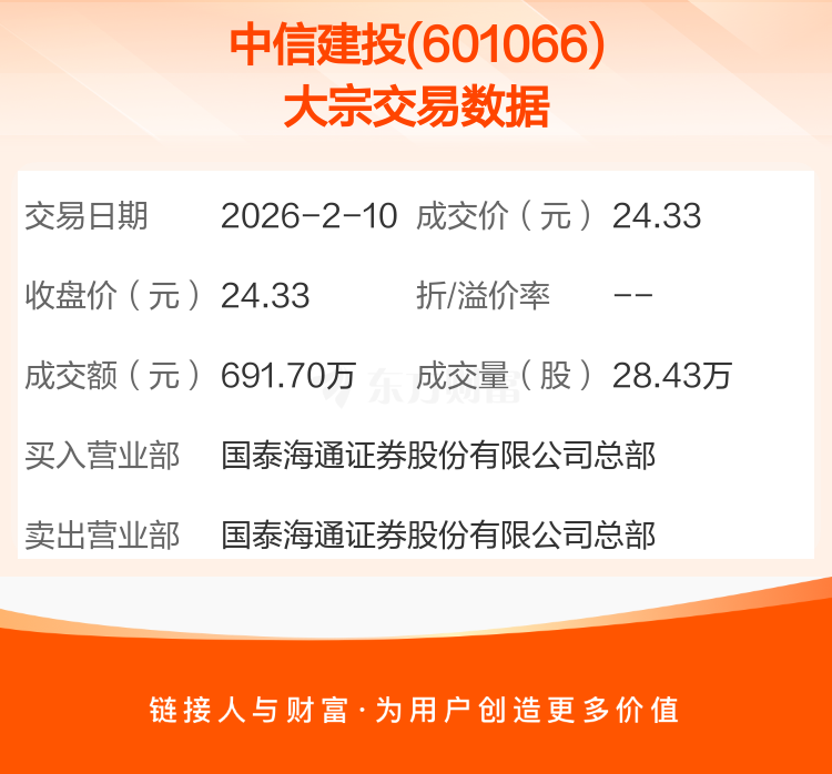 2026年2月10日,中信建投发生1笔大宗交易,共成交28.43万股,成交金额691.70万元。