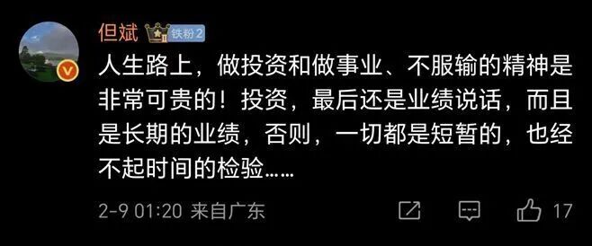 该文迅速引发行业大佬关注。东方港湾董事长但斌在微博发帖表示:“人生路上,做投资和做事业、不服输的精神是非常可贵的!投资,最后还是业绩说话,而且是长期的业绩,否则,一切都是短暂的,也经不起时间的检验。”