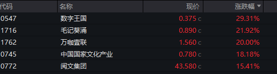 文化传媒板块涨幅居前,数字王国大涨超29%,阅文集团涨超15%,大麦娱乐、中国儒意均涨超5%。
