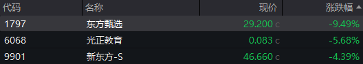 教育板块下跌,东方甄选跌超9%,新东方-S跌超4%。