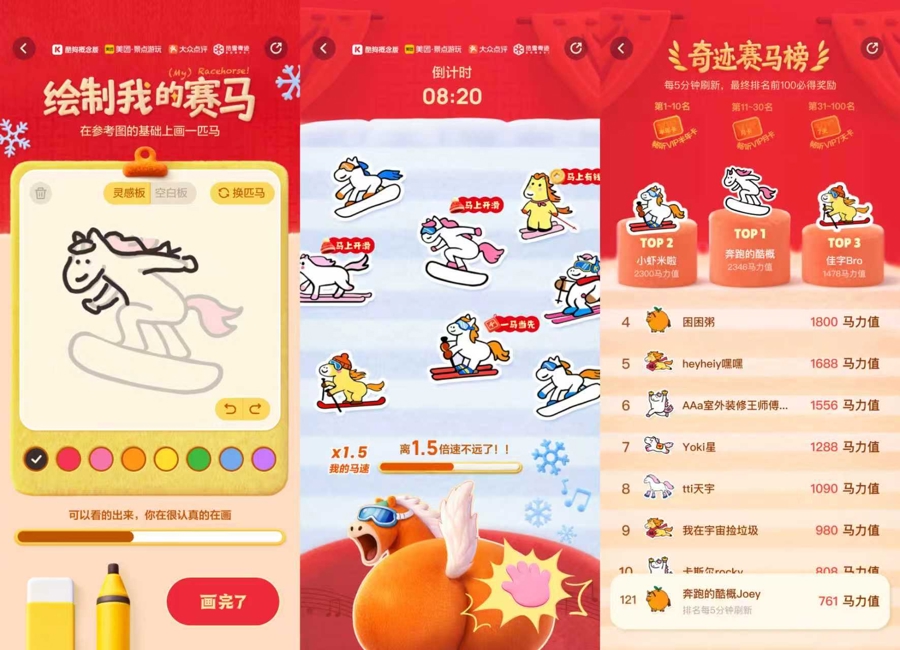 此次新春企划突破传统新春活动模式,深度贴合年轻群体潮玩需求,精心打造专属玩法,例如用户可发挥创意,手绘专属赛马形象。而且只需分享活动,即可参与幸运抽奖,有机会赢取广州热雪奇迹滑雪券、六福珠宝运财墩墩马等重磅好礼;“奇迹赛马榜”前100名实力玩家,更可额外斩获酷狗概念版畅听VIP专属奖励,让马年好运与悦耳旋律一路相伴。