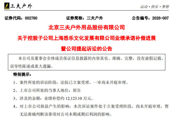 2月10日,三夫户外公告,公司控股子公司上海悉乐文化发展有限公司(简称“上海悉乐”)未完成2022-2024年度的业绩承诺。根据相关协议约定,成都乐投帮企业管理咨询中心(简称“成都乐投帮”)需承担业绩补偿责任;宋勇作为成都乐投帮普通合伙人,承担无限连带责任。