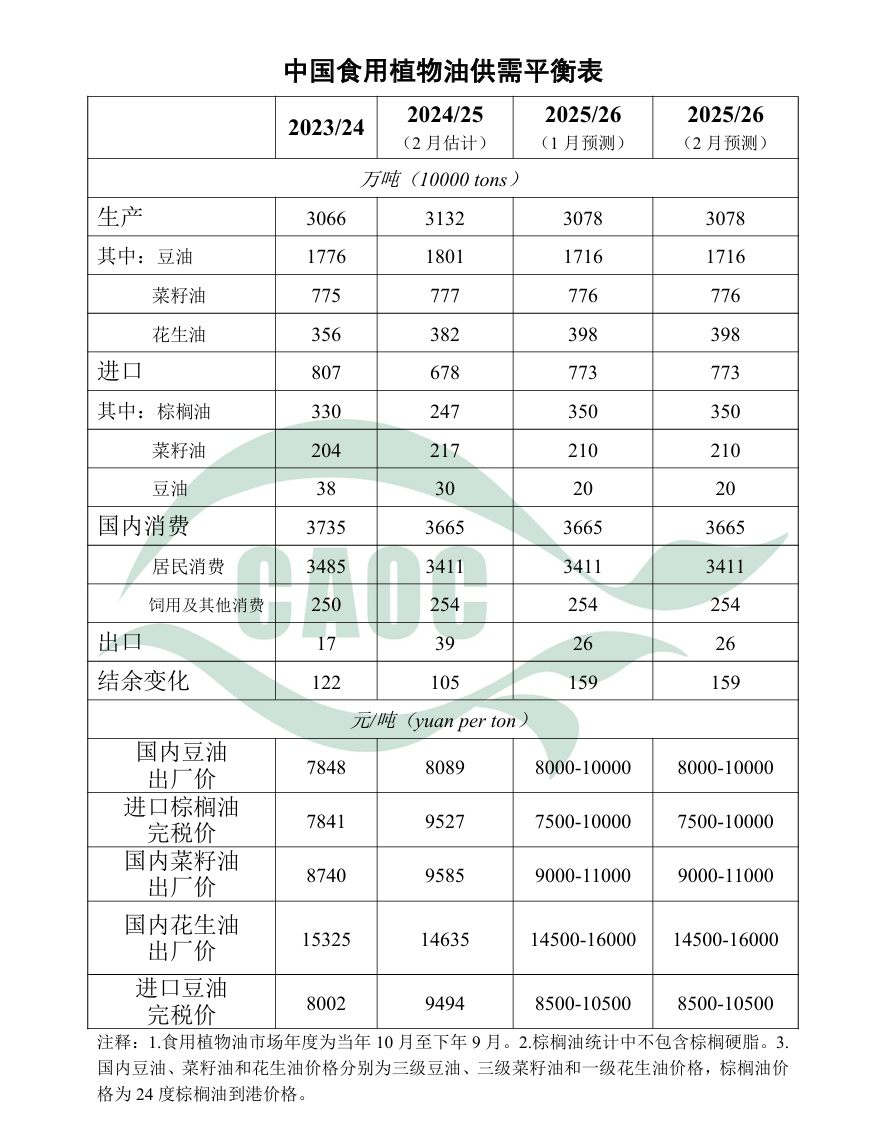农业农村部:2月对中国食用植物油供需预测与上月保持一致
