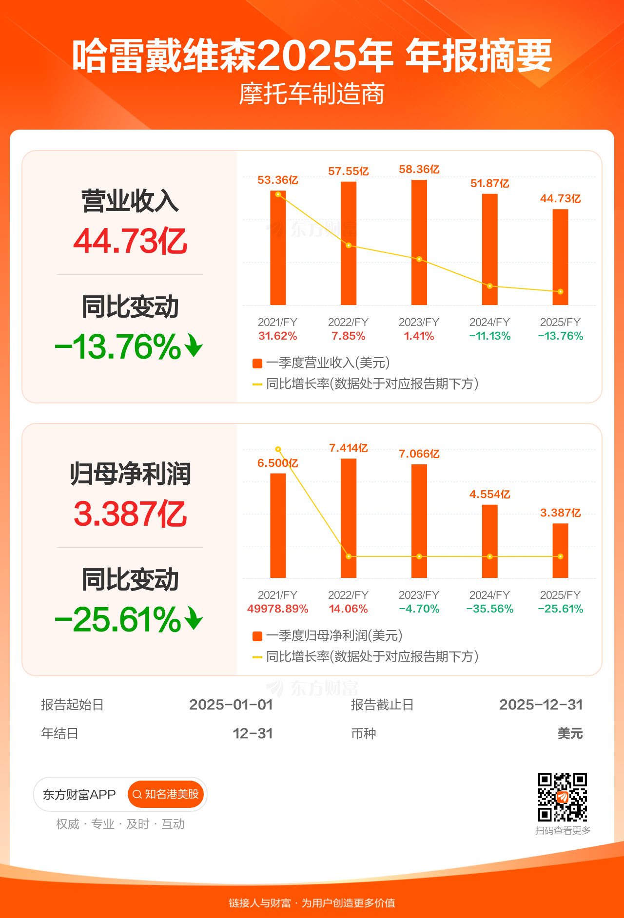 哈雷戴维森2月10日发布年报业绩,截至2025年12月31日的12个月内,该公司营业收入44.73亿美元,同比减少13.76%;公司权益持有人应占溢利(归母净利润)3.39亿美元,同比减少25.61%。