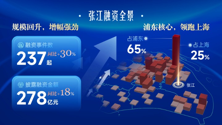 上海去年每四起科创融资,就有一起发生在张江,这是记者从刚刚由张通社联合加冕研究院发布的《2025年张江企业融资榜单》中获得的信息。数据显示,过去一年张江共有210家张江企业完成237起融资,披露融资金额278亿元,投融资事件数量和融资金额同比增长30%和18%。张江融资规模约占浦东65%,约占上海全市的25%。
