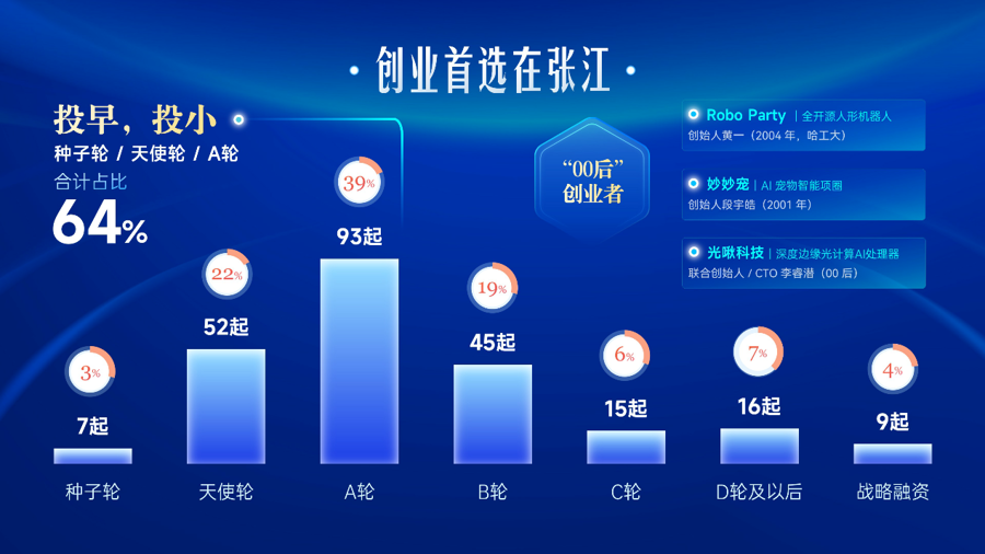 从融资轮次来看,237起融资中种子轮、天使轮和A轮占比64%,这不仅是资本的偏好转向,更说明很多创业者将张江作为他们创业的起点。其中,A轮融资以93起、39%的占比成为全年最活跃阶段,说明张江正在集中孕育一批具备放大潜力的成长期企业。 从企业画像看新获投企业的含金量十足。210家获投企业中有75家高新技术企业、95家专精特新中小企业、27家专精特新小巨人企业和33家独角兽企业。另外,有8家企业有全球“首个”“首例”级别的突破,9家企业填补了国内技术空白,近30家在攻坚未来技术方向。如愈方生物、恩凯赛药等企业在端粒调控、能化NK细胞等技术上实现全球首创突破,开普勒机器人实现量产并斩获国际赛事冠军,奥朋医疗完成全球首例机器人辅助EVAR手术等。