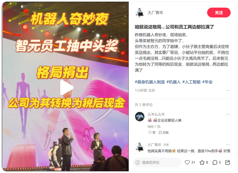 记者获悉,该名员工在2月8日晚的公司直播中,通过B站官方抽奖系统抽中了一辆价值约10万元的名爵MG4汽车一年使用权。但他选择了让出这个奖项。不到24小时后,公司在年会上用等额现金“奉还”。而那辆被让出的MG4汽车将通过B站渠道重新抽取,即使之前没有观看晚会直播的观众,只要登上B站智元AGIBOT的账号,完成指定抽奖任务,即可参与抽奖,预计除夕19:00夜开奖,中奖名单将在智元官方社交媒体公示。