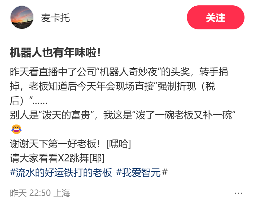 智元机器人的“硅基春晚”还有后续。“机器人奇妙夜”成功举办后,1600名员工见证了戏剧性的一幕:智元创始人邓泰华站在舞台上,宣布将一笔税后10万元的现金奖励,发给一名前一天刚刚放弃汽车大奖的员工。
