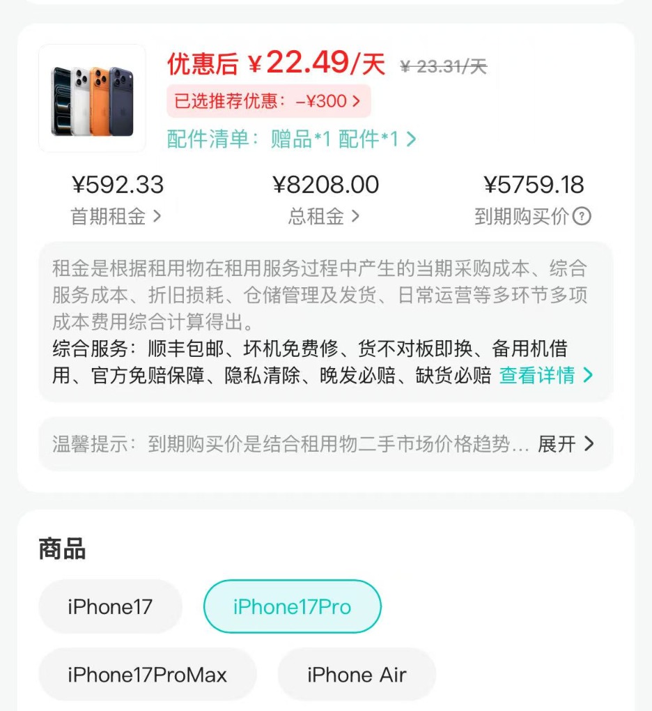 费用方面,界面新闻记者在人人租上选择了一台全新的iPhone17Pro(512GB),租期365天,显示首期租金为592.33元,其余11期每期692.33元,12期总租金为8208元,到期购买价为5759.18元。