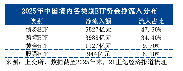 这些增长的背后是政策支持、市场认知提升与资金流入的多重共振。2025年,《关于推动中长期资金入市工作的实施方案》等一揽子政策相继落地;随着市场有效性提升,主动投资获取超额收益的难度增加,市场对低成本、高透明、风格清晰的指数化投资认同度加深,资金加速涌入。全年债券ETF以5527亿元(占比47.6%)的净流入居首,反映资金对稳健资产的配置需求;股票、跨境与黄金ETF也分别获得944亿元、3988亿元和1127亿元的净流入。