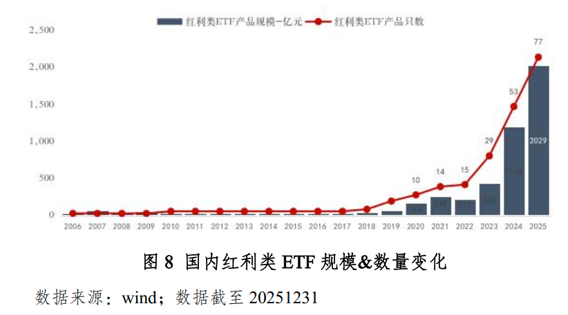截至2025年底,全市场红利类ETF(含跨境)规模较2023年底增长超360%,达2029亿元。策略从单一的“高股息”向“红利+”升级,其中“红利+低波”策略产品规模超1003亿元,因其更好的防御性和体验感深受稳健型资金追捧。龙头产品华泰柏瑞红利低波ETF规模已超267亿元,较2024年初增长逾9倍。产品线也从A股拓展至港股、央国企等细分赛道,满足多样化配置需求。