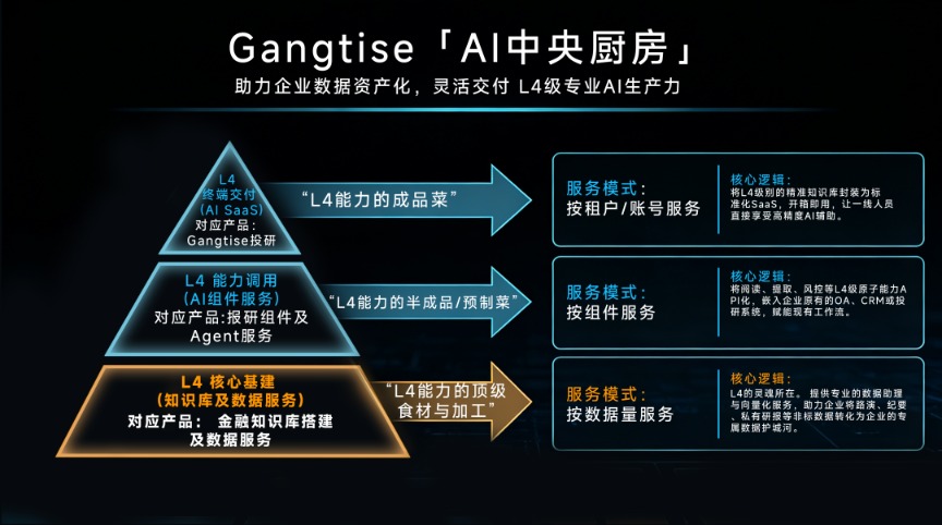 岗底斯(Gangtise)“AI中央厨房”的三层架构,是这一逻辑从算法向工程转化的物化形态,它将复杂的智能化治理转化为标准化的造路工程。底层L4级基建通过对非标信息的向量化解析,将庞杂的数据泥泞夯实为支撑决策的数字化“路基”;中层组件将原子逻辑封装为预制模块,通过API实现与现有工作流的“无缝接驳”;顶层SaaS则将高精度知识库直接转化为穿透业务本质的“视点通途”。通过这种层级清晰的工业化交付模式,将买方捕获α与上市公司实现价值治理的过程,从依赖个人偶然性的“丛林探险”,重塑为基于标准化基础设施的“系统化行进”。