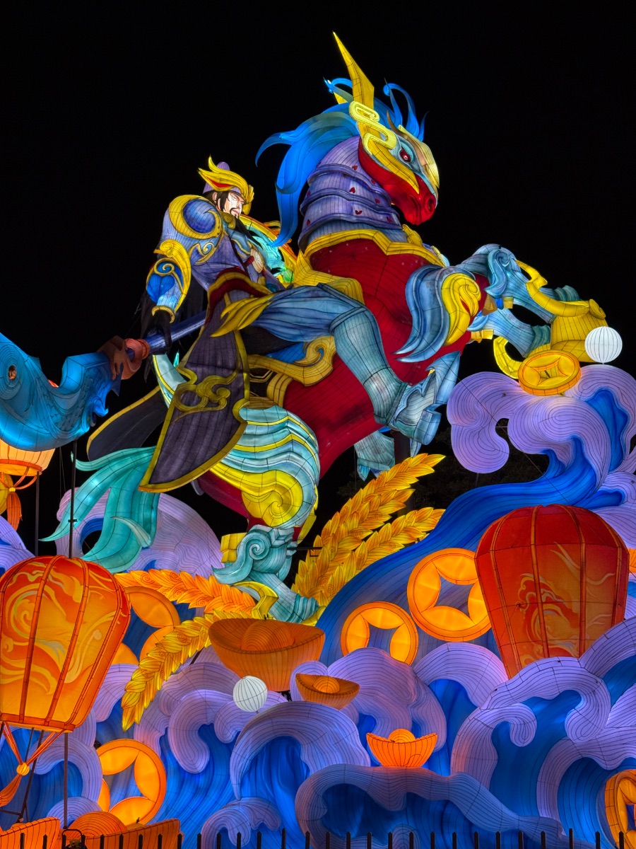 作为展区最具人气的核心灯组团,王者荣耀系列以“王者荣耀仙侠宇宙×新春祈愿民俗”为双轴,打造沉浸式祈愿动线,四款灯组首尾相连,以“武圣”关羽为核心,鲁班七号、庄周、云缨等多位峡谷英雄化身新春福使,红灯笼、金福字、祥瑞金兽错落交织,构成一幅恢宏的国风赛博画卷。