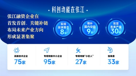 从企业画像看,张江融资企业的“含金量”十分直观。2025年获投企业中,包括高新技术企业75家、专精特新中小企业95家、专精特新“小巨人”27家,独角兽33家。