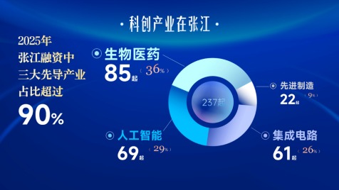 《榜单》显示,2025年,张江科创融资的行业投向更趋集中,发生在生物医药、人工智能、集成电路等上海三大先导产业的融资件数合计占比达到91%,较2024年的82%进一步提升。