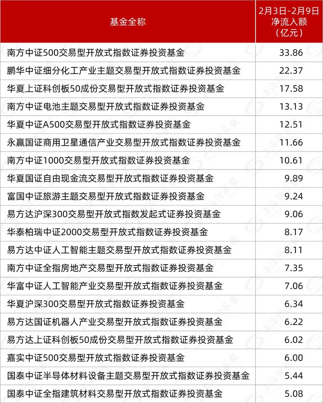 整体而言,2月3日至9日,股票型ETF净流入83.89亿元。其中,南方中证500ETF净流入33.86亿元,鹏华化工ETF净流入22.37亿元,华夏科创50ETF净流入17.58亿元,南方电池ETF、华夏中证A500ETF、永赢卫星ETF、南方中证1000ETF等净流入均超10亿元。