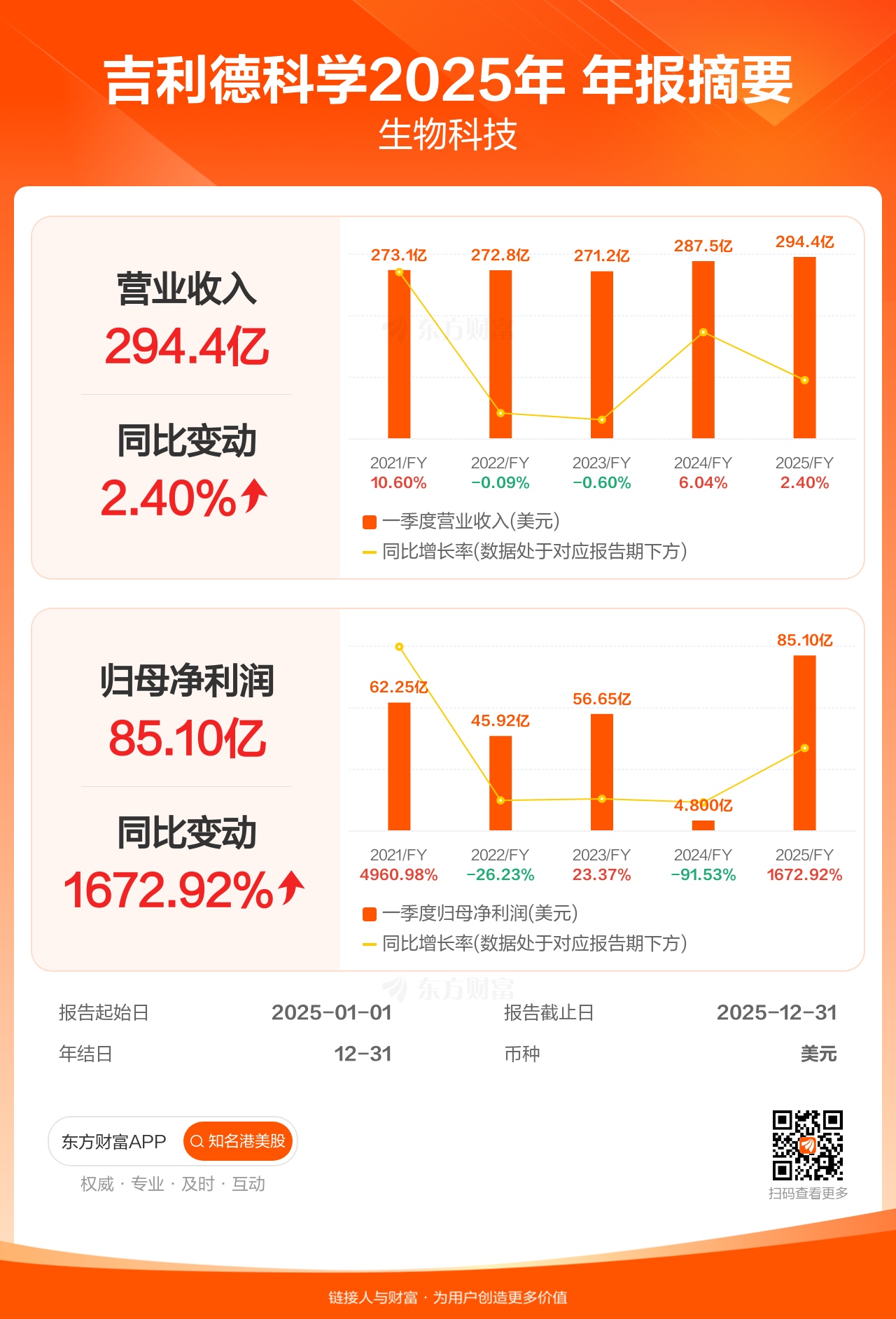 吉利德科学2月10日发布年报业绩,截至2025年12月31日的12个月内,该公司营业收入294.43亿美元,同比增长2.40%;公司权益持有人应占溢利(归母净利润)85.10亿美元,同比增长1672.92%。