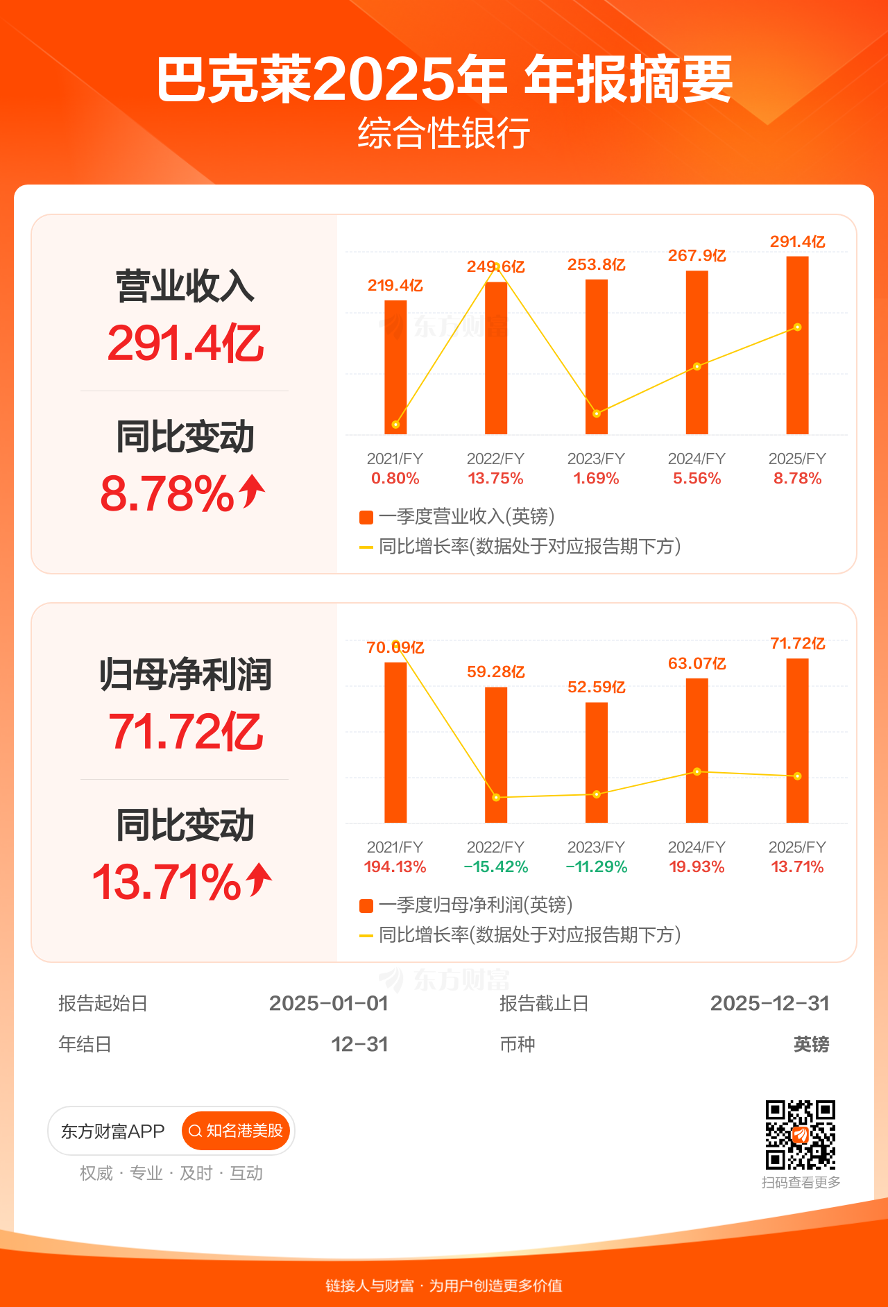 巴克莱2月10日发布年报业绩,截至2025年12月31日的12个月内,该公司营业收入291.40亿英镑,同比增长8.78%;公司权益持有人应占溢利(归母净利润)71.72亿英镑,同比增长13.71%。