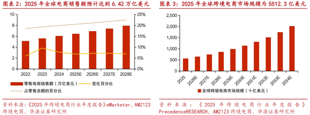 2025 年全球跨境电商市场规模为 5512.3 亿美元,预计从 2026 年的 6363.4 亿美元增至 2034 年的约 2 万亿美元, 复合年增长率高达15.44%。 随着我国跨境电商市场规模的快速发展, 跨境电商新业态对传统外贸高质量发展的促进作用越发明显。