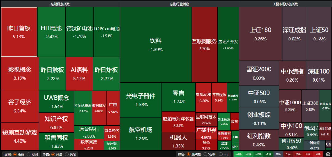 A股三大指数昨日震荡整理,沪指涨0.13%,深证成指涨0.02%,创业板指跌0.37%。沪深京三市成交额超过2.1万亿。行业板块涨跌互现,文化传媒、游戏、船舶制造、教育、通信服务板块涨幅居前,贵金属、光伏设备、珠宝首饰、能源金属、商业百货板块跌幅居前。