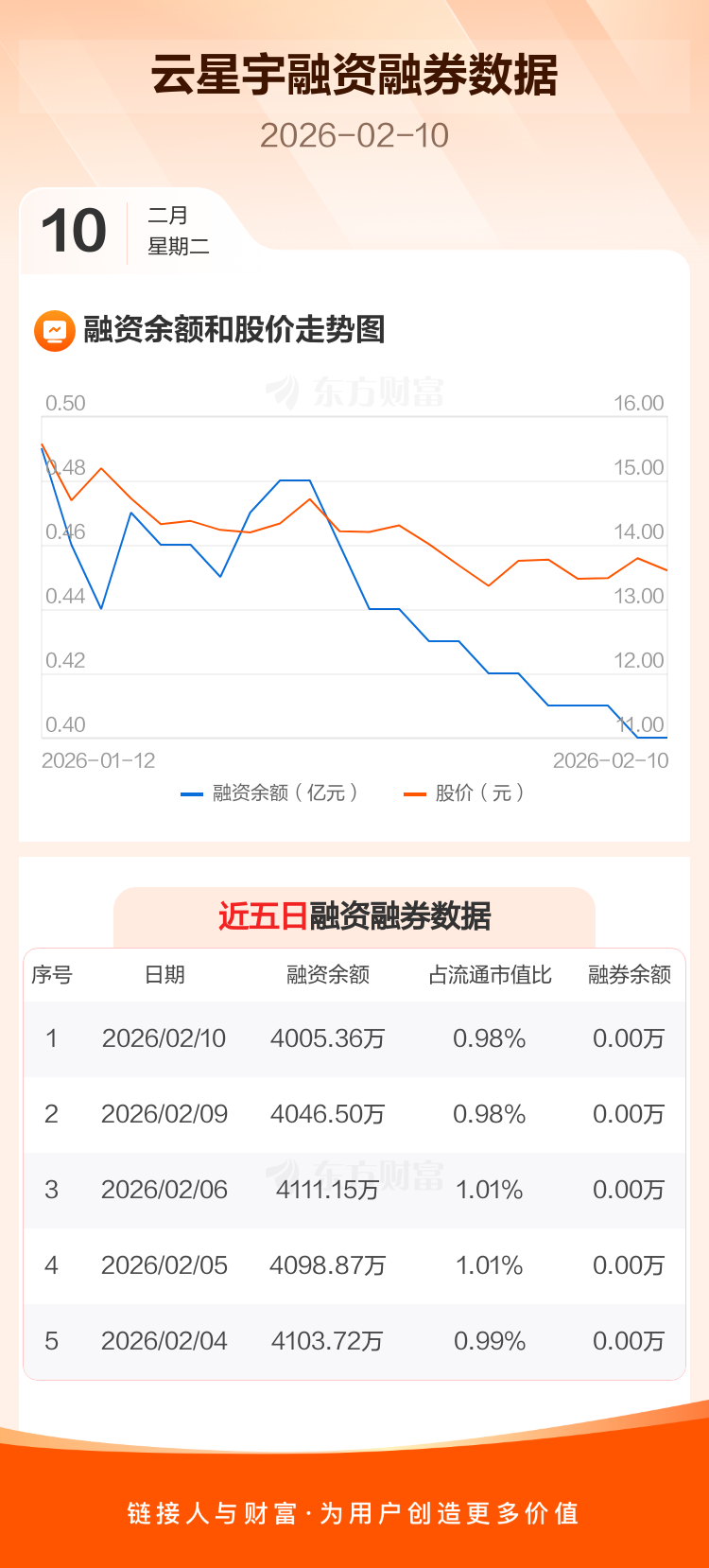 交易所最新数据显示,云星宇于2026年2月10日获融资买入55.93万元,融资偿还97.07万元,当日融资净偿还41.14万元。目前,该股融资余额4005.36万,占流通市值比例为0.98%。