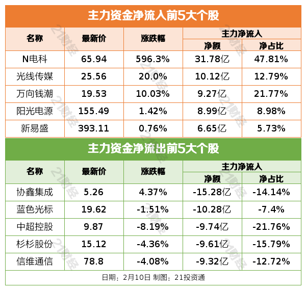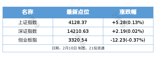 2月10日,市场全天窄幅震荡,三大指数涨跌不一,科创50指数涨近1%。截至收盘,沪指涨0.13%,深成指涨0.02%,创业板指跌0.37%。沪深两市成交额2.11万亿,较上一个交易日缩量1439亿。