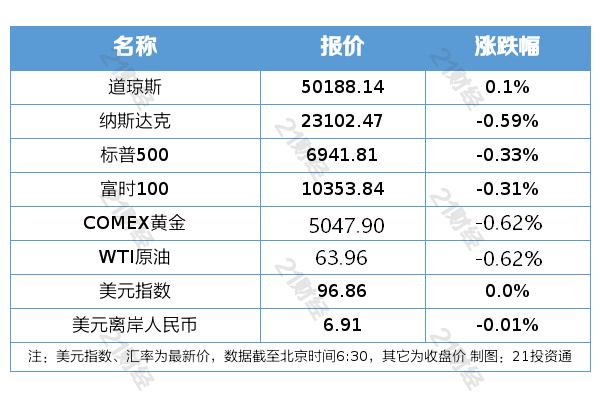 纽约股市三大股指2月10日涨跌不一。截至当天收盘,道琼斯工业平均指数比前一交易日上涨52.27点,收于50188.14点,涨幅为0.10%;标准普尔500种股票指数下跌23.01点,收于6941.81点,跌幅为0.33%;纳斯达克综合指数下跌136.20点,收于23102.48点,跌幅为0.59%。